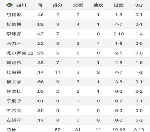打上海,四川男籃全場得到52分,球隊以52:88大敗。而前幾天,他們輸?shù)母鼞K,那就是對陣北京男籃,那場比賽四川男籃被全方面壓制,首節(jié)就得到10分,次節(jié)更是只拿到6分,整個上半場球隊僅有16分入賬,比這次輸?shù)倪€要多,最終全隊40分鐘就拿到46分,被北京男籃狂拉51分(46:97)。四川男籃這賽季到底有多爛呢?數(shù)據(jù)顯示,這賽季7場比賽,他們7戰(zhàn)全負,球隊0勝7負排名CBA積分榜倒數(shù)第一位,他們場均輸給對手25分之多,就連實力一般的同曦男籃都能贏他們接近30分。
