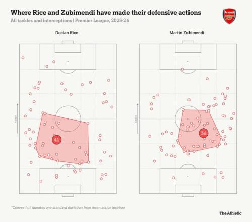 在無(wú)球狀態(tài)下,蘇比門迪在阿森納隊(duì)內(nèi)中場(chǎng)三區(qū)的場(chǎng)均搶斷次數(shù)(0.94次)排名第一,而賴斯排名第六(0.63次)。盡管造成這一情況的部分原因是后者的防守動(dòng)作覆蓋區(qū)域更大,如下方圖表所示。